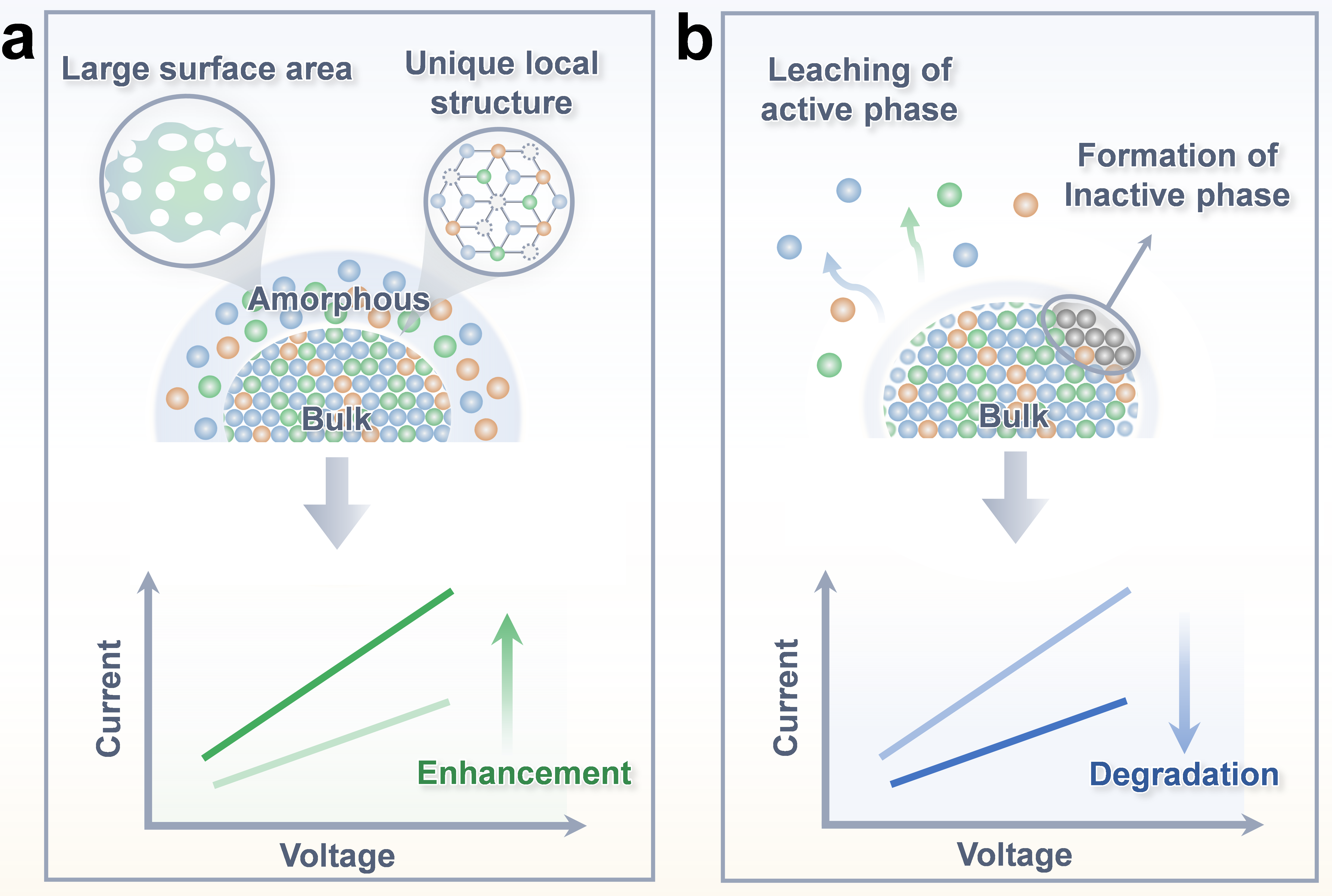 催化剂重构对催化反应是一把双刃剑(图3)。一方面,重构可促使催化剂表面粗糙化,增加电化学活性面积;重构过程中形成的富缺陷、低配位及亚稳态结构,也可能提供具有高本征活性的催化位点。另一方面,重构可能引发活性元素溶解、活性相失活或生成无活性副产物,从而导致催化剂活性与稳定性下降。深入理解重构的驱动因素与动态演化路径,是实现高活性、高稳定性电催化剂理性设计的关键所在。