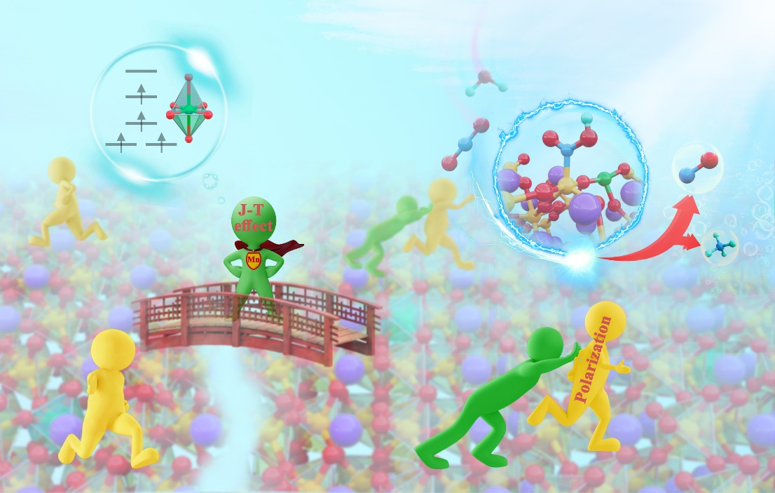 黄科科教授团队提出Jahn-Teller畸变介导机制通过拉长的MnO6八面体,驱动相邻原子沿统一方向发生协同位移,在无需外电场的情况下解决极化矢量无序问题。具体而言,通过锰与氧配体间的电子重分布调控Mn的局域电荷,从而实现最优电子构型(Mn t2g3eg1),诱发最大Jahn–Teller畸变。值得注意的是,Jahn–Teller单元的结构演化直接推动Fe和O原子沿[001]轴向位移,加剧FeO6八面体的不对称形变,形成定向极化。最终,在去极化电场驱动下,载流子快速分离促进CO2向CO的转化,在纯水条件下产率达到30.51 μmol·g⁻¹·h⁻¹,接近原始BiFeO3的五倍。该研究提出了通过Jahn-Teller畸变调控极化矢量的创新策略,从电子结构角度为铁电光催化剂的开发提供了新见解。