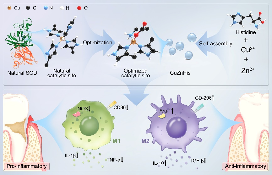 图1 优化铜催化位点制备的CuZnHis组装体及其抗炎机制。