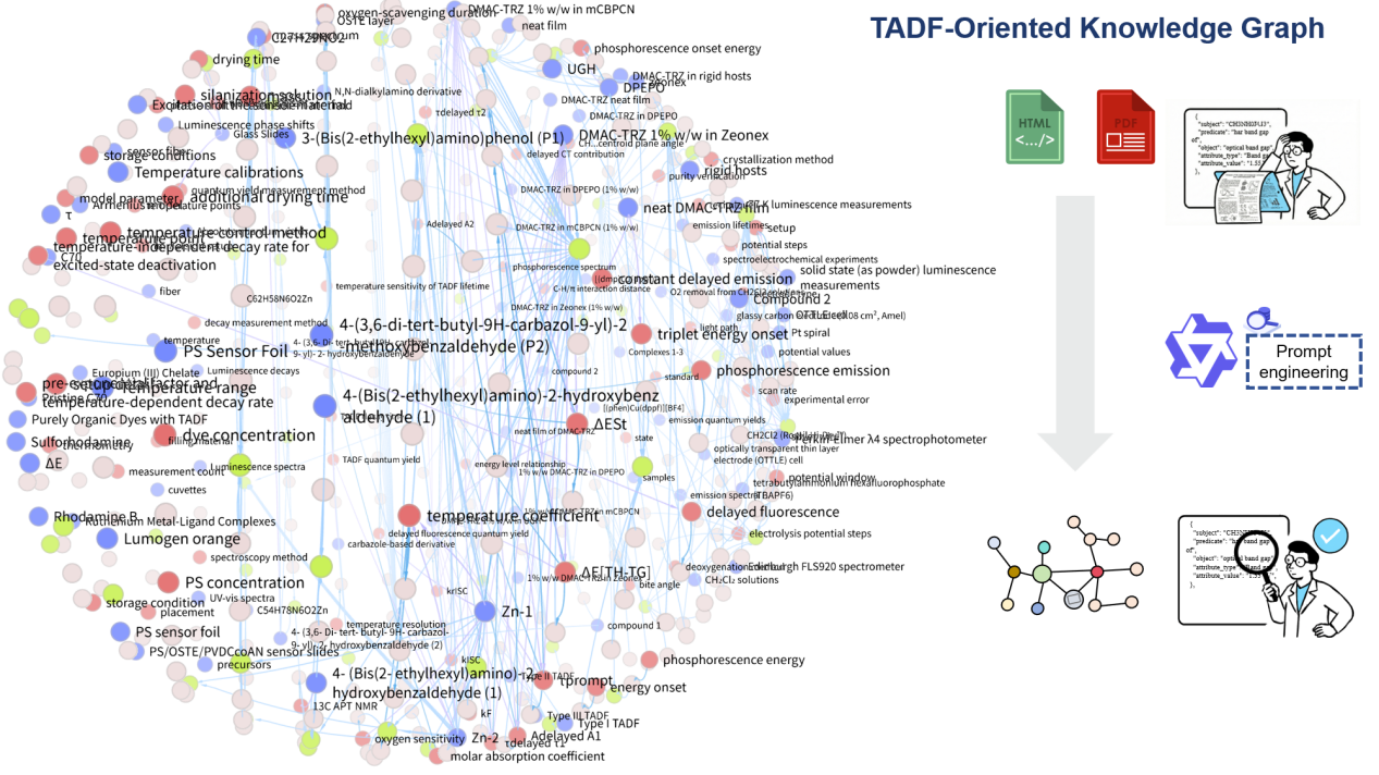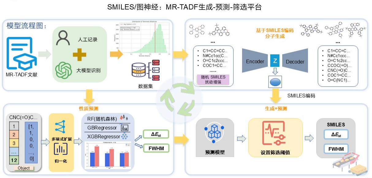 邹陆一教授研究团队当前聚焦于人工智能加速多重共振型热活化延迟荧光(MR-TADF)材料的开发。MR-TADF材料凭借高激子利用率与窄带发射的双重优势,成为OLED领域的研究热点。然而,该类材料的结构与性质探索受限于研发周期长、成本高,且传统理论计算手段存在一定局限性与预测精度不足等问题,制约着新材料的研发进程。同时,MR-TADF文献普遍存在数据分散难汇总、分子结构难标准化、跨文献知识难关联等问题。针对上述挑战,邹陆一教授团队建立了MR220、MR264和MR585等体系的MR-TADF材料专用数据库;率先开发定量预测智能软件(SOGCN);创新搭建起“生成-预测-筛选”一体化智能平台;提供准确评估MR-TADF材料最优组合计算方法进行双重验证;依据平台筛选结果合成并表征新型MR-TADF完成实验闭环;相较于56核时的超算平台,实现了新材料开发效率跨量级的提升。这种特色研究模式,取得了一系列研究成果。此外,团队还提出了大语言模型与知识图谱协同方案,从文献中自动抽取分子结构、光物理性质等关键信息,将其转化为结构化数据,构建可检索、可追溯、可扩展的TADF领域知识库。