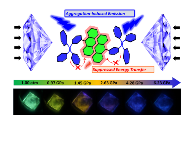 从分子间相互作用出发,首先设计构筑了超分子蒽π-π二聚体堆积结构:将蒽连接在四苯乙烯(TPE)苯环的间位,形成TPE取代基偏向于蒽平面一侧的分子构象,为实现蒽面对面反平行π-π堆积提供位阻条件;一旦蒽π-π堆积形成,TPE基团自动将形成的蒽二聚体隔离保护起来,获得离散型蒽π-π二聚体堆积。利用Suzuki偶联方法将蒽(AN)和TPE化学键合成一个新化合物(mTPE-AN),通过溶剂挥发法培养得到蒽π-π二聚体堆积晶体。先前的蒽π-π作用二聚体在高压条件下表现为通常的发光红移猝灭,而具有聚集诱导发光性质的TPE晶体在高压下呈现发光红移增强的特殊现象。然而,mTPE-AN晶体在高压下则展现出发光不仅蓝移而且增强的罕见现象。为了揭示现象背后的特殊本质机理,进行了系统的理论与实验相结合研究。首先,高压同步辐射XRD和理论模拟结果排除了压力相变导致蒽π-π二聚体堆积破坏,发生二聚体到单体蓝移发光的可能性,同时核磁和质谱方法确认不存在光化学反应导致的发光蓝移原因。TPE晶体高压实验暗示短波长蓝移增强发射可能来自于TPE的聚集诱导发光而且高压吸收光谱和变温实验证实了体系存在从TPE蓝光到蒽二聚体绿光发射之间的能量转移过程。在常压下,TPE激发态完全能量转移到蒽二聚体,mTPE-AN晶体表现为蒽二聚体绿色发光;当压力超过1.23 GPa,TPE发射与蒽二聚体吸收光谱重叠减小,能量转移受到抑制,导致短波长TPE发射出现。随压力进一步增强到4.28 GPa,能量转移抑制和聚集诱导发光两种机制同时作用,导致压力诱导发光蓝移并增强的特殊现象。