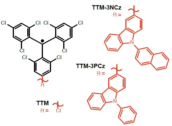 图2 自由基TTM、TTM-3NCz和TTM-3PCz的分子结构