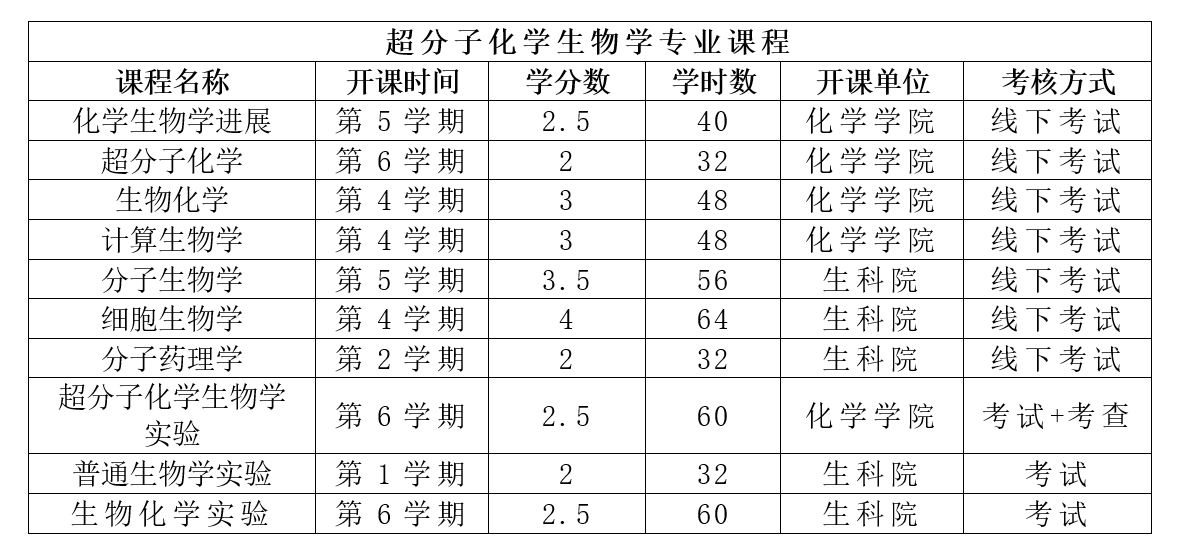 要求的通识教育课程、专业类学科基础课程、专业课程(依据专业规定)、超分子化学生物学专业课程(见下表)、并累计参加超分子化学生物学研究中心举办的学术讲座不少于20次,颁发“超分子化学生物学微专业”证书。