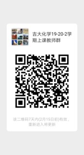 2.课程(团队)负责人为课程线上教学的第一负责人。(1)扫描二维码(附图1)加入“吉大化学19-20-2学期上课教师群”,尽快组织教师熟悉掌握线上教学相关技术、进行教学所需资料的准备;(2)做好课程教学内容安排,组织课程团队教师线上集体备课,统一课程各部分重难点、作业、测试和期末成绩评定方式等;(3)制定完备的课程考核体系,包括但不限于直播签到,章节测验,线上提交课后作业等形式,确保学生按时、保质的进行在线学习;(4)建立及时跟踪了解学生远程学习效果的反馈机制。