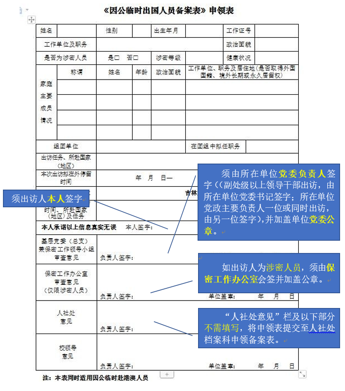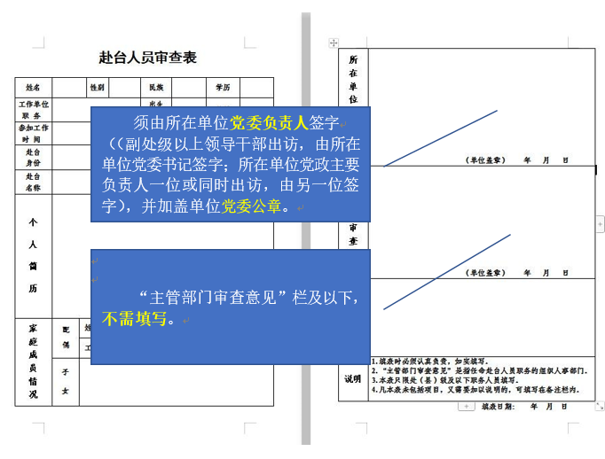 因公临时赴台任务须提交审查表,相关签字盖章要求如下图: