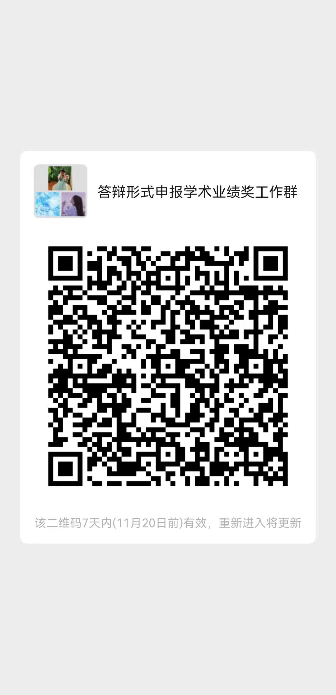 研究生学术业绩奖学金,申报答辩的同学请于11月14日24点前扫码加入微信群,答辩时间每人5分钟。11月15日进行群内“拟申请奖学金等级”小程序报名。