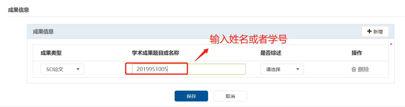 申报研究生于5月8日前使用个人邮箱账号登录“一张表”平台//one.acggwan.com,在“研究生评奖评优管理”-“研究生评奖评优申报”栏,点击“新增”进行信息填报及佐证材料上传,其中成果信息只需要输入“姓名或者学号”,然后在已审核通过的成果库中选择3篇代表作参评。同时扫码入“2023届优秀毕业生申报群”。成果库中未录入的成果需及时录入-导师审核-科研办姜老师审核。