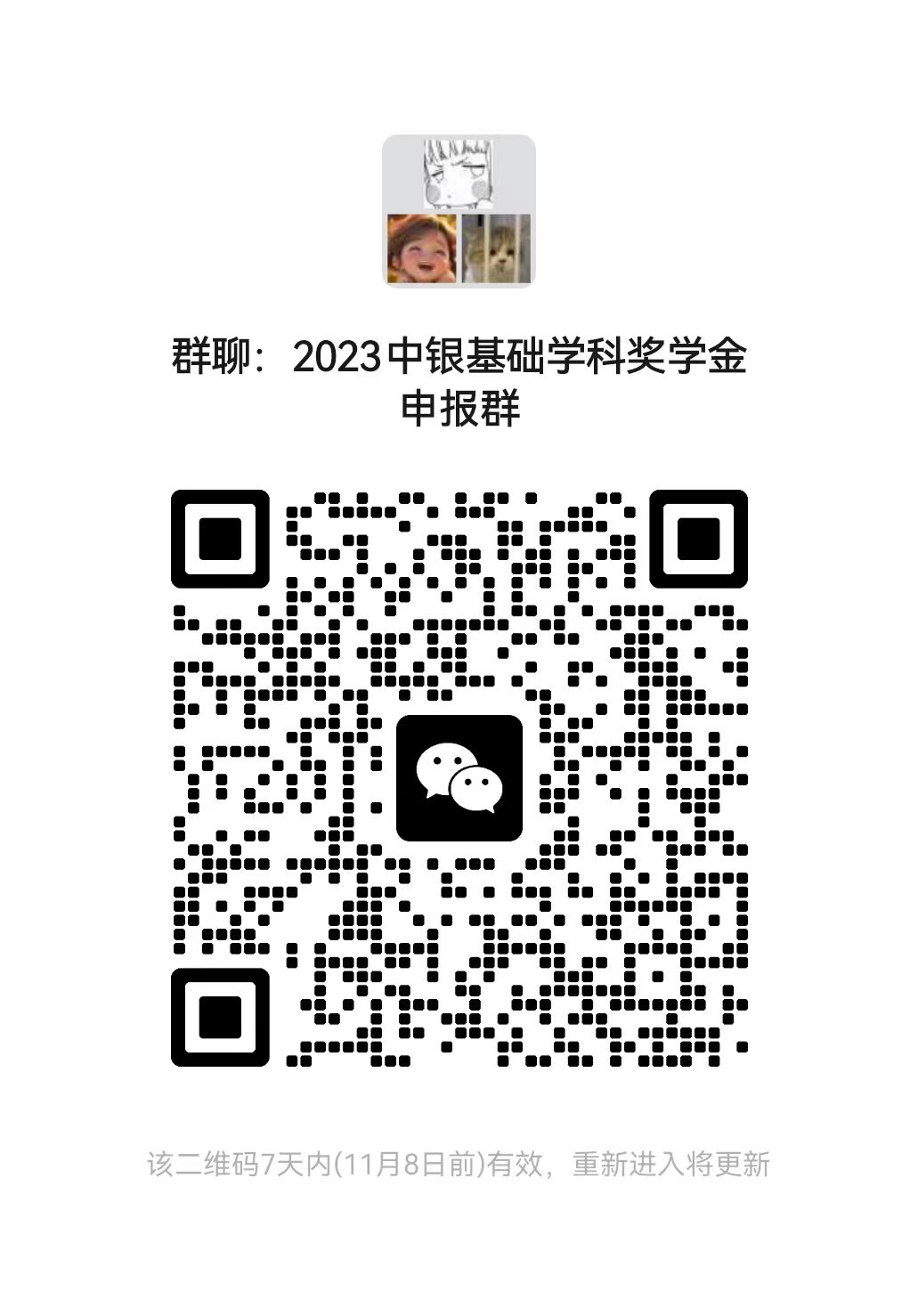 (1)申报研究生于11月3日12:00前使用个人邮箱账号登录“一张表”平台(//one.acggwan.com),在“研究生评奖评优管理”-“研究生评奖评优申报”栏,点击【新增】进行【中银基础学科奖学金】信息填报,同时扫码加入微信群。