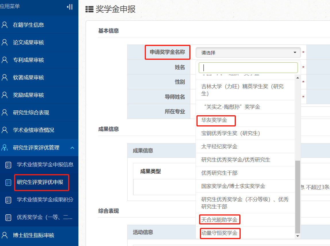 (1)申报人于11月30日12:00前使用个人邮箱账号登录“一张表”平台(//one.acggwan.com),在“研究生评奖评优管理”-“研究生评奖评优申报”栏,点击【新增】进行【华友奖学金】信息填报,同时扫码加入申报微信群。
