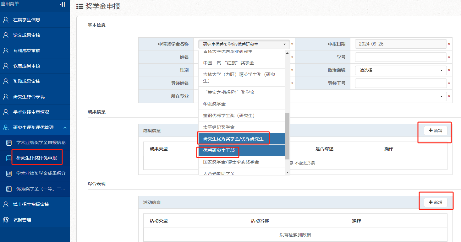 1、申报人请于10月13日前使用个人邮箱账号登录“一张表”平台(//one.acggwan.com),在“研究生评奖评优管理”-“研究生评奖评优申报”栏,点击【新增】进行【研究生优秀奖学金/优秀研究生】、【优秀研究生干部】申报信息填报,申报研究生优秀奖学金无需选择等级,依据综合得分由高到低自动定级;成果信息栏点击“新增”后输入“学号”,然后从已审核通过的成果库中选择不超过3篇代表作参评;综合表现—活动信息点击“新增”后输入“姓名或学号”,然后从已审核通过的活动中选择上一学年参与的活动。
