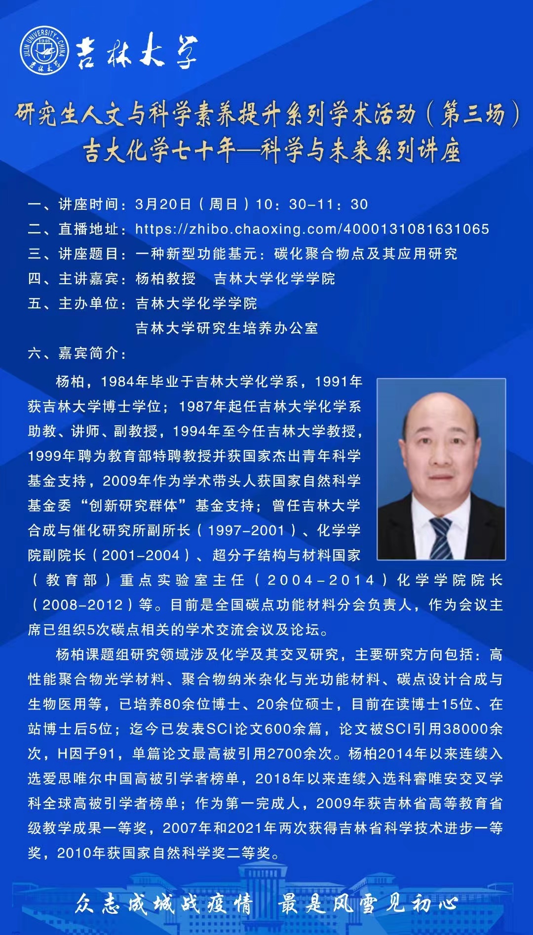 吉大化学70年院庆系列活动——科学与未来系列讲座:一种新型功能基元:碳化聚合物点及其应用研究