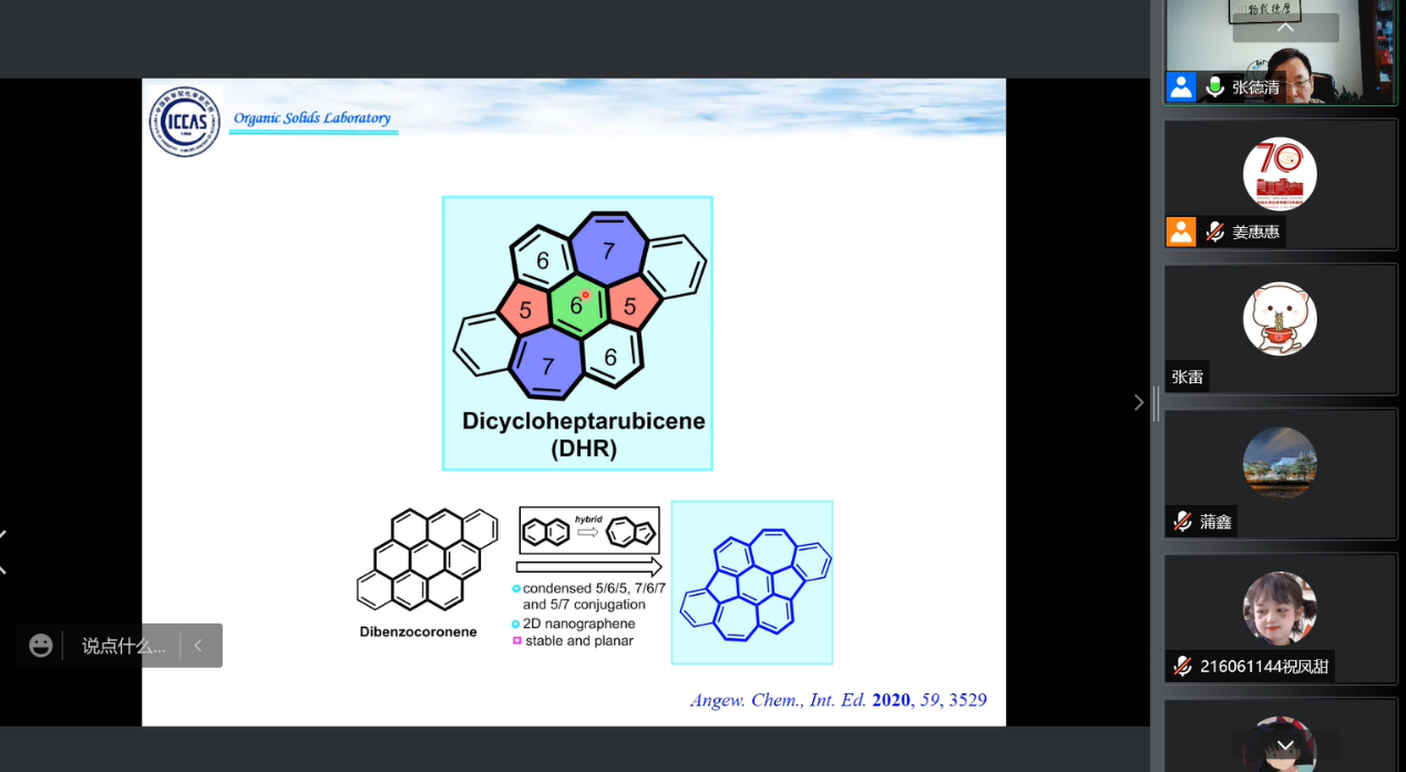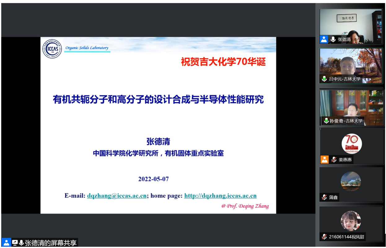 5月7日上午,中国科学院化学研究所研究员、国家杰出青年科学基金获得者张德清应邀线上做客“吉大化学七十年——科学与未来系列讲座”,以“有机共轭分子和高分子的设计合成与半导体性能研究”为题,为学院师生作学术报告。