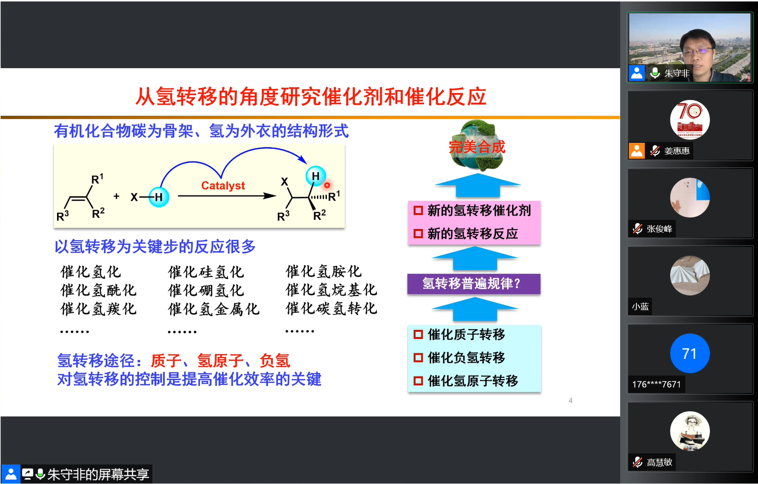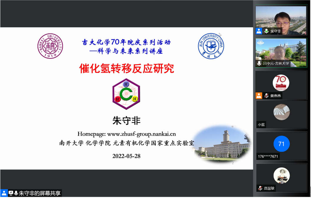 教授,国家杰出青年科学基金获得者朱守非应邀线上做客“吉大化学七十年——科学与未来系列讲座”,以“催化氢转移反应研究”为题,为学院师生作学术报告。