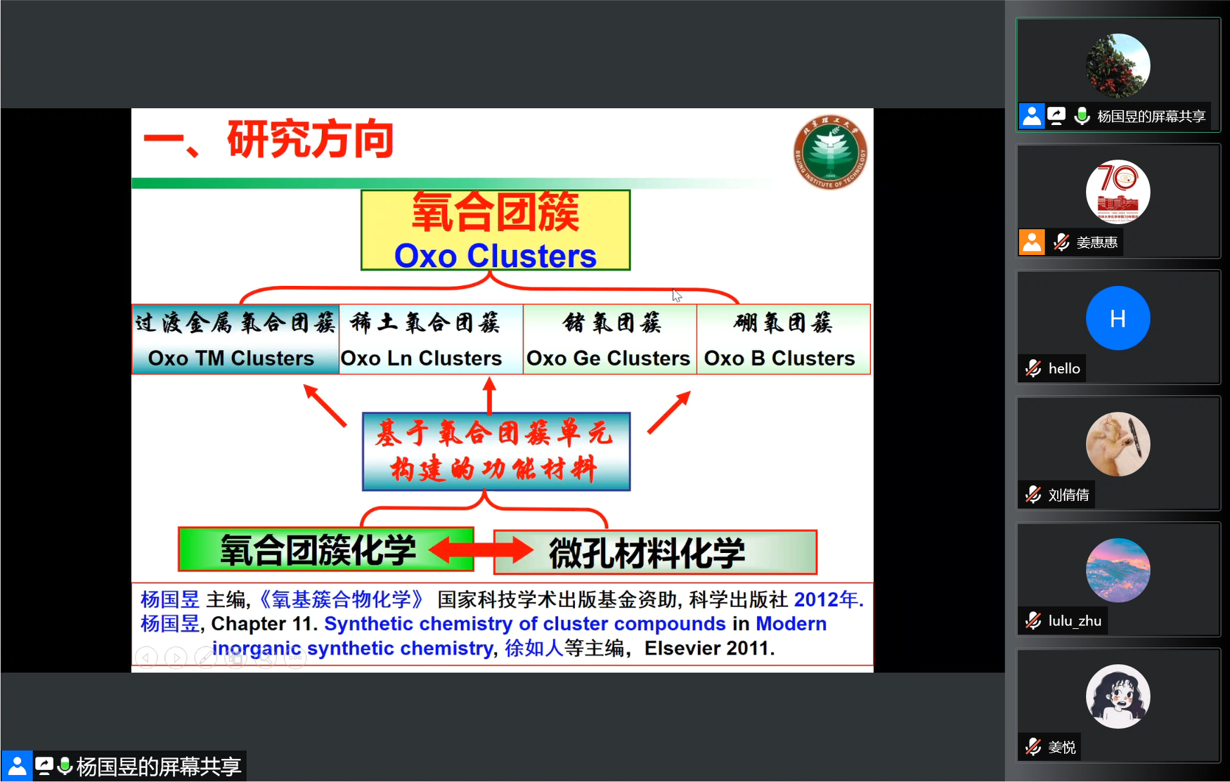 讲座中,杨国昱教授围绕氧合团簇化学,全面地介绍了其课题组在过渡金属氧簇、稀土氧簇、锗氧团簇及硼氧团簇等氧合团簇合成领域的研究进展。在交流互动环节,杨国昱教授耐心详细地解答了院内外师生的问题,并对相关领域的发展做出了展望。ACG港湾