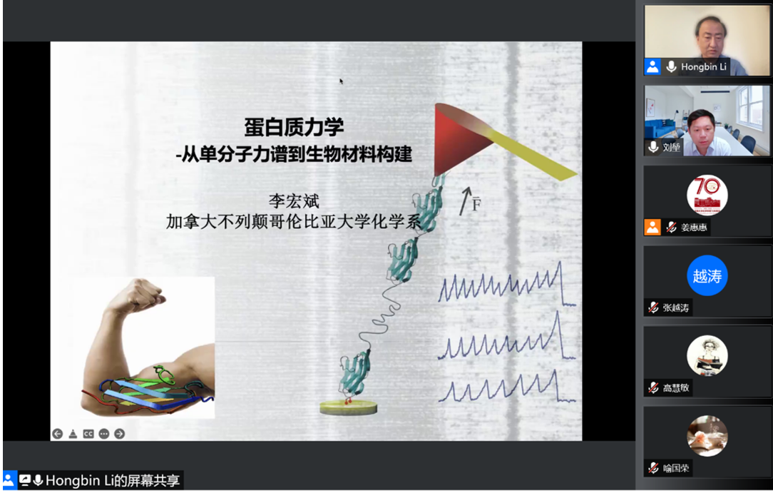 6月2日上午,加拿大不列颠哥伦比亚大学教授李宏斌应邀线上做客“吉大化学七十年——科学与未来系列讲座”,以“蛋白质力学:从单分子力谱到生物材料构建”为题,为学院师生作学术报告。