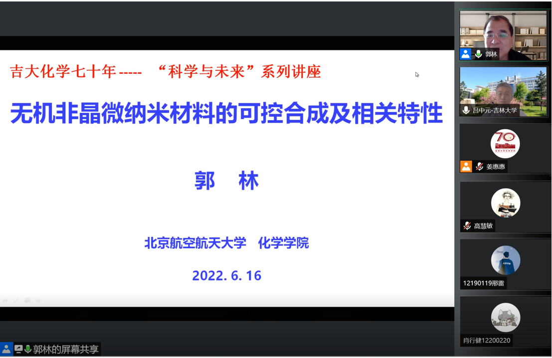 6月16日上午,北京航空航天大学首批校长直聘教授、国家杰出青年科学基金获得者郭林应邀线上做客“吉大化学七十年——科学与未来系列讲座”,以“无机非晶微纳米材料的可控合成及相关特性”为题,为学院师生作学术报告。