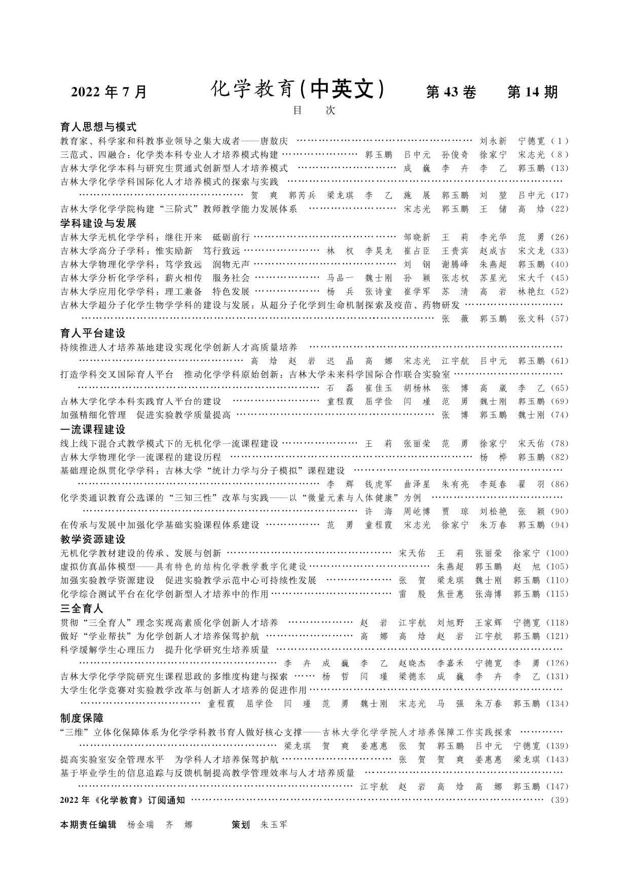 化学学科创建70周年,《化学教育》精心推出庆祝专刊,共设育人思想与模式、学科建设与发展、育人平台建设、一流课程建设、教学资源建设、三全育人、制度保障等七大版块。通过32篇文章,全方位、多角度展示了学科在先进教育理念、高水平学科建设、特色人才培养模式、高素质师资队伍建设、育人资源与平台建设等方面取得的成就,以及对未来高水平交叉复合型化学创新人才培养的探索。