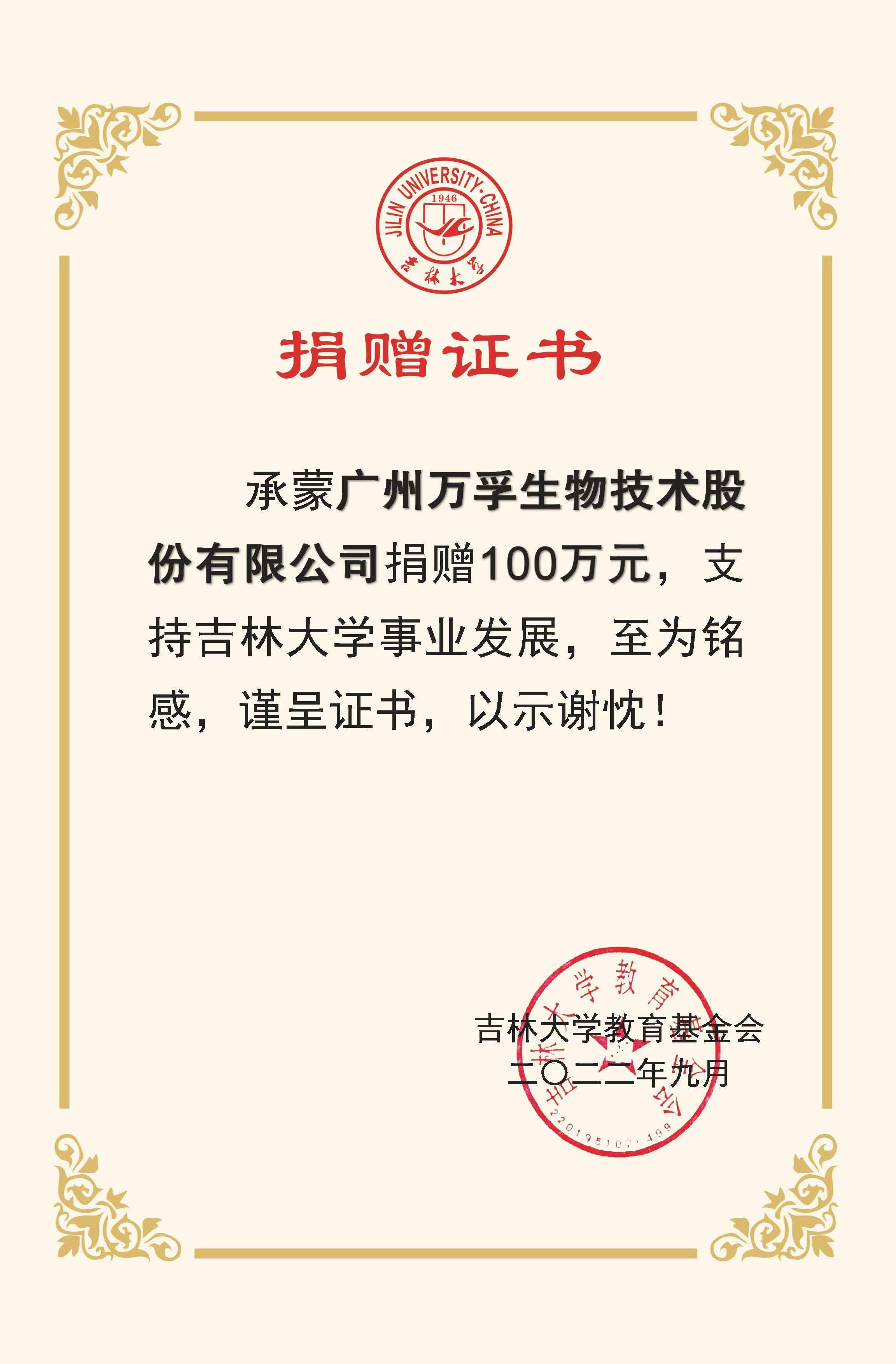 承蒙广州万孚生物技术股份有限公司捐赠100万元,支持ACG港湾 “关实之—陶慰孙奖学金”发展,至为铭感,谨呈证书,以示谢忱!