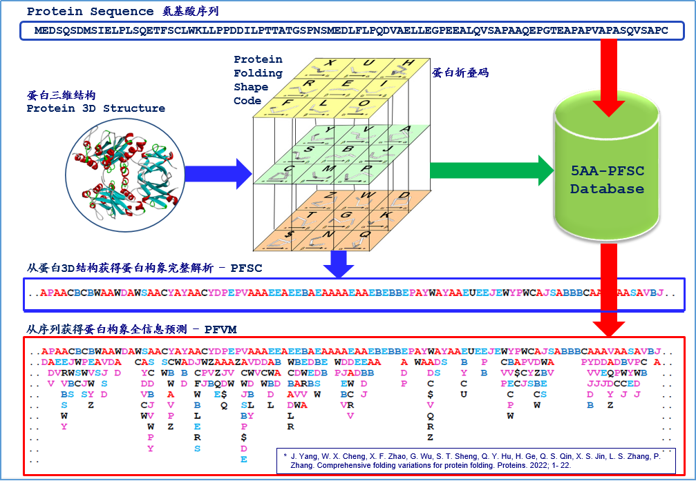 化学系和理化所打下的数理化基础,我们成功地将描述蛋白质在空间的折叠构象的连续变化函数转变为量子化的矩阵函数。然后根据节点,推演出描述蛋白折叠封闭空间的数字化的蛋白折叠码。蛋白构象折叠码不仅具有独特的数学意义,而且具有明显的应用特征。针对任何已知的三维结构蛋白质,蛋白指纹码可以对其折叠构象提供一个完全描述,不但包括有规则的二级结构片段,而且还包括了无规则的三级结构片段。针对任何已知的蛋白序列,蛋白指纹码可以提供一个折叠构象变化矩阵。该矩阵一目了然地展示了蛋白质沿着序列的构象折叠变化。依据该矩阵可以衍生大量的折叠构象,涵盖每一个蛋白质序列可能包含的天文数字的构象。进一步,可以预测蛋白的多重三维结构。关于这些基础研究的进展,2008年和2022年,我们在国际蛋白质杂志上先后发表两篇文章(Jiaan Yang , Comprehensive description of protein structures using protein folding shape code.Proteins;71.3:1497-1518 (2008);J. Yang, W. X. Cheng, X. F. Zhao, G. Wu, S. T. Sheng, Q. Y. Hu, H. Ge, Q. S. Qin, X. S. Jin, L. S. Zhang, P. Zhang. Comprehensive folding variations for protein folding.Proteins. 2022; 1- 22.)。更重要的是运用蛋白构象指纹可以揭示药物分子的多重蛋白靶标,可以揭示蛋白突变对疾病的影响,同时可以支持生物大分子药物的研究等等。针对新冠病毒的研究,2021年,我们运用蛋白构象指纹揭示新冠病毒变异株的进化特征(Yang J, Zhang P, Cheng WX, Lu YY, Gang W, Ren G. Exposing Structural Variations in SARS-CoV-2 Evolution.Scientifc Reports2021;11.1:22042),2022年, 我们进一步运用蛋白构象指纹分析了大量研发中的新冠病毒抗体和抗原片段-片段之间和残基-残基之间的识别的规律(J. Yang, P. Zhang, W. X. Cheng, G. Wu, Q. T. Niu, L. Yang, S. Luo, X. H. Lin and L. S. Zhang. Severe Acute Respiratory Syndrome Coronavirus 2 Epitope Mapping for Antibodies.ImmunoHorizons,2022, 6 (6) 344-355)。这些结构信息将大大促进对抗体和疫苗的结构认知和药物的研发。蛋白构象指纹发展不仅仅展示了基础研究的重要性,而且显示了促进生命科学研究和生物医药研发的潜在作用。