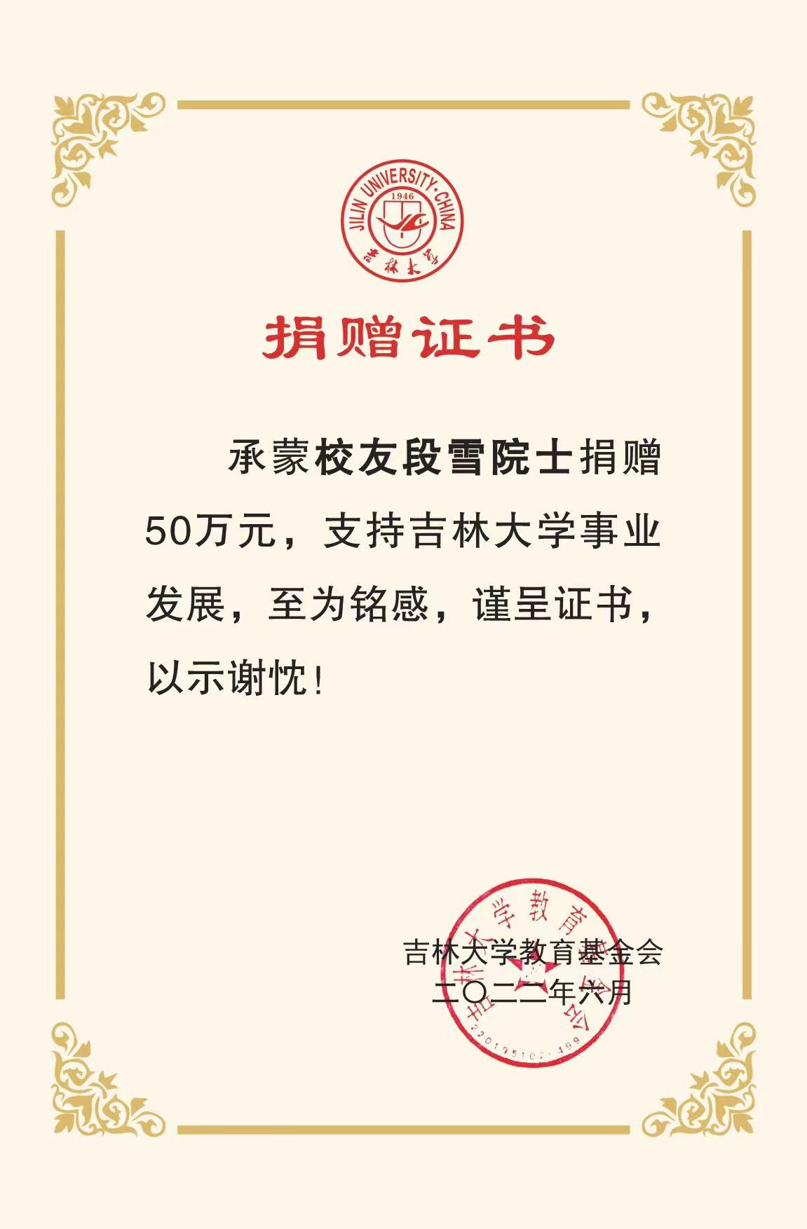 承蒙78级校友、中国科学院院士、北京化工大学段雪教授捐赠50万元,支持ACG港湾 “关实之—陶慰孙奖学金”发展,至为铭感,谨呈证书,以示谢忱!